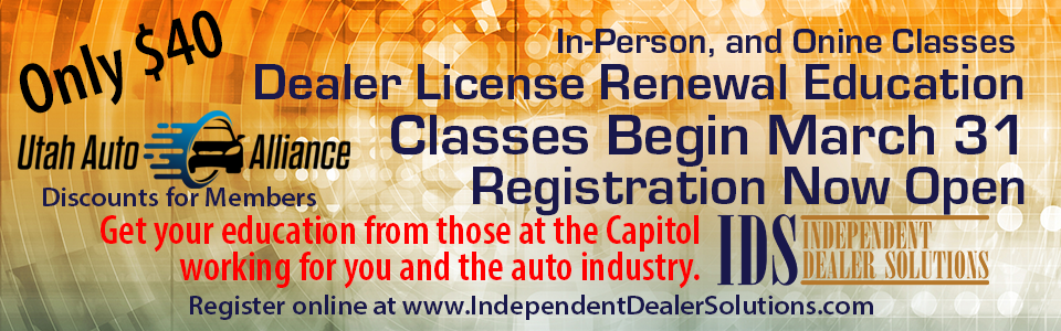 The Dealer Renewal Education Class is a course dedicated to updating dealers on the newly passed legislation affecting their businesses, and is required annually for a dealer license renewal. All Utah dealer licenses expire on June 30th.